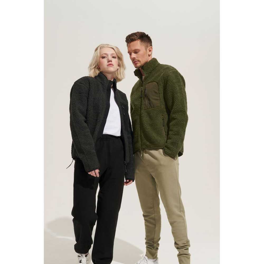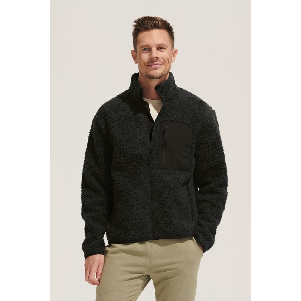 Куртка унисекс из фактурной искусственной шерпы с гладкой отделкой из таслана.