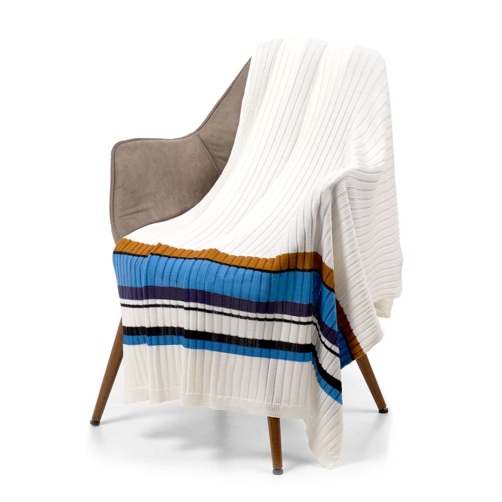 Яркий полушерстяной плед фактурной вязки Friolenta освежит современный интерьер: широкие контрастные линии создадут цветовой акцент в лаконичном дизайне спальни или гостиной.