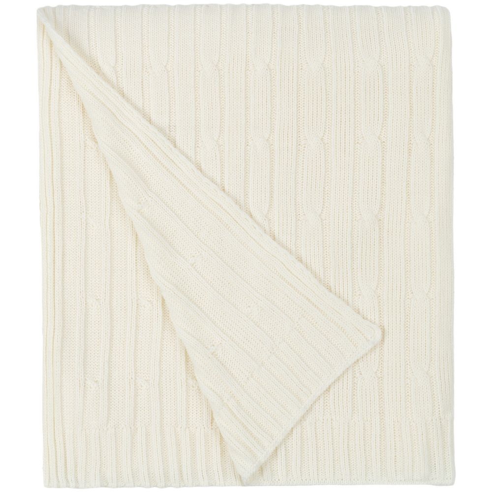 Модель: однотонный плед с фактурной вязкой, которая позволяет сделать его воздушным и объемным. Чередуя различные типы петель на гладком полотне, можно вывязать любую графику — логотип, текст, товарный знак.