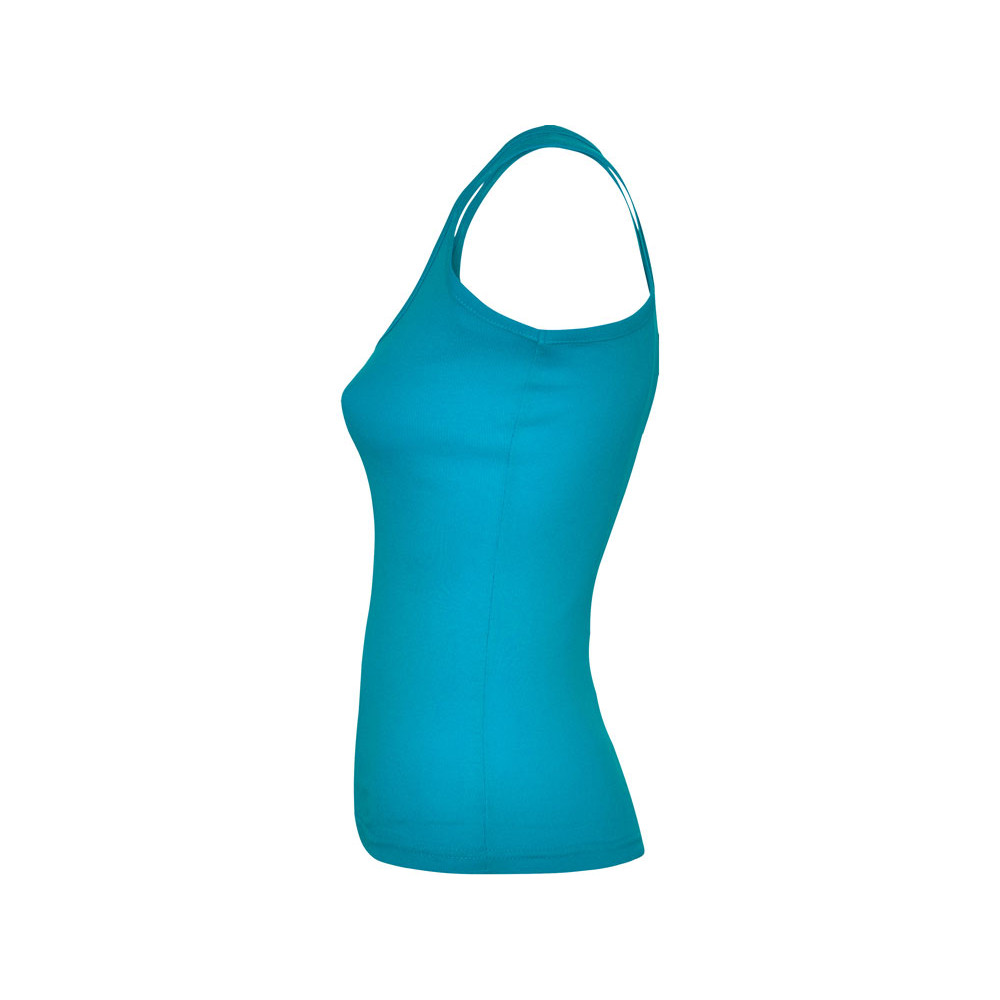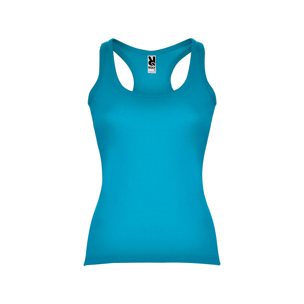 Майка приталенного силуэта с глубоким круглым вырезом горловины. Спортивная спинка, боковые швы.