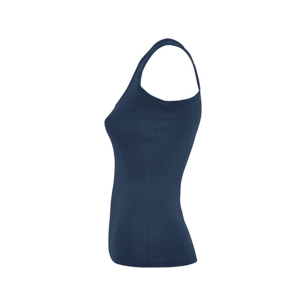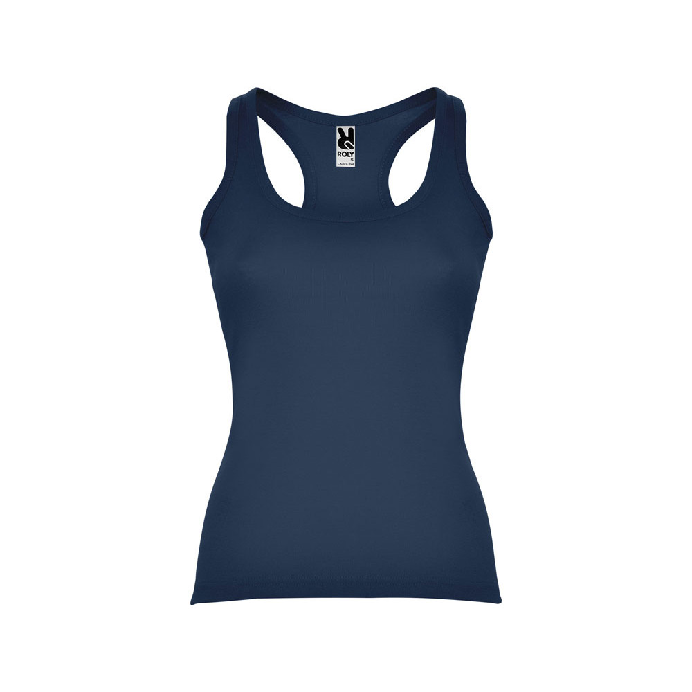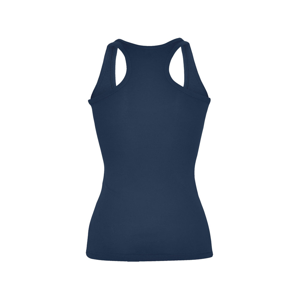 Майка приталенного силуэта с глубоким круглым вырезом горловины. Спортивная спинка, боковые швы.