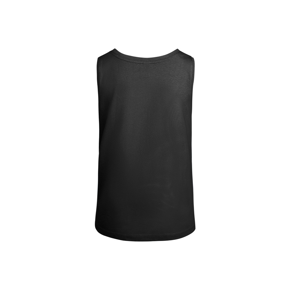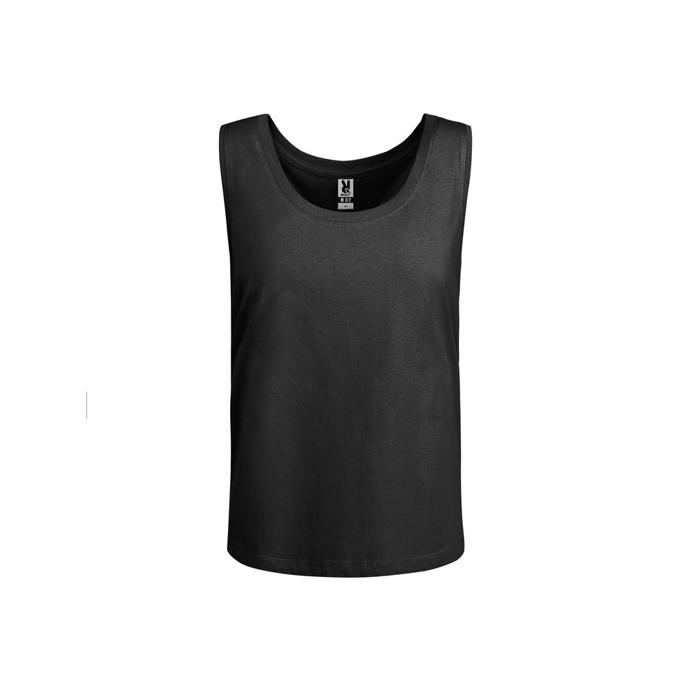 Свободная женская футболка с широкими бретелями. Вырез и проймы обработаны бейкой из риба 1x1. Подол округлой формы. Боковые швы.