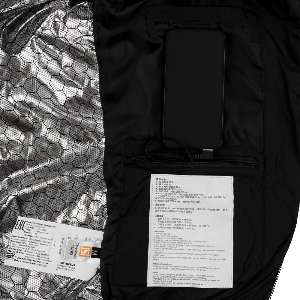Утепленная куртка со встроенным нагревательным элементом из углеродного волокна в области спины и шеи. Работает от внешнего аккумулятора (в комплект не входит), подарит ощущение тепла и комфорта в любую погоду.