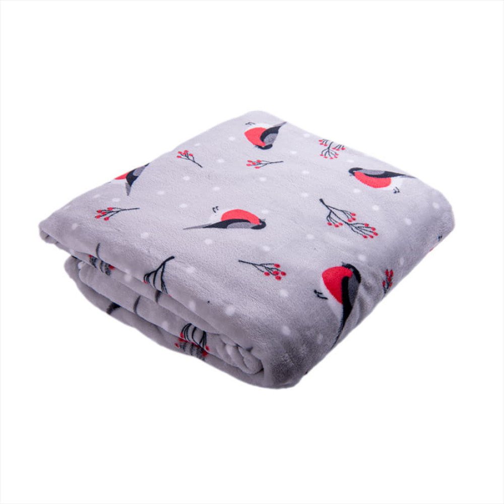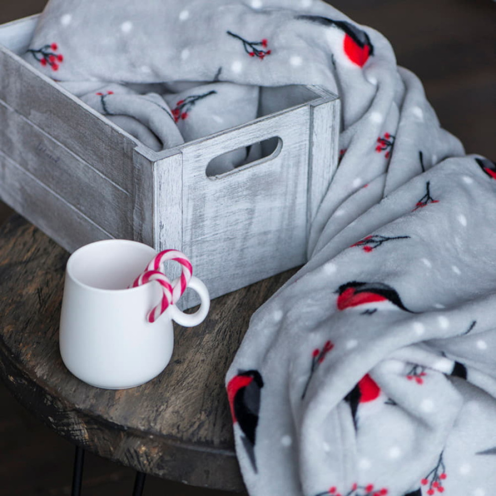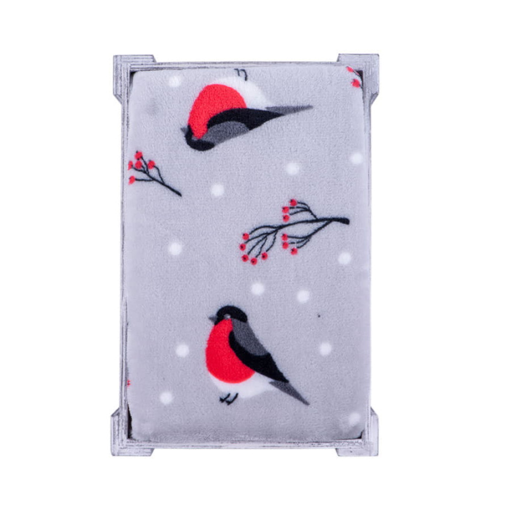 Плед новогодний "Снегири" в подарочной коробке; серый с красным; 130х150 см; полиэстер, 220 гр/м2