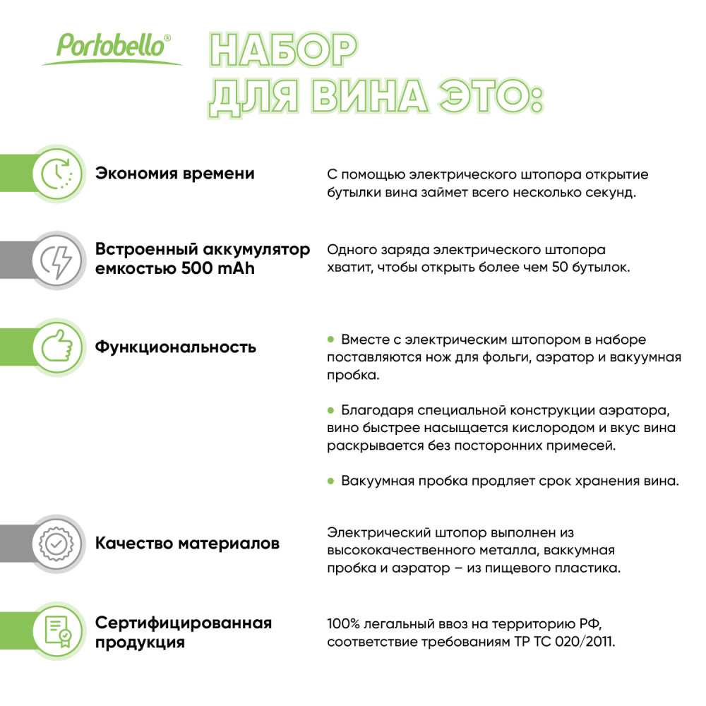 Электрический штопор работает от встроенного аккумулятора, поэтому вам не нужно постоянно менять батарейки. Одного заряда хватит, чтобы открыть более, чем 50 бутылок.